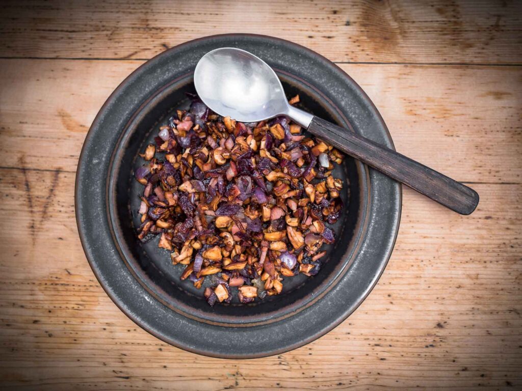- Fräs lök och svamp i smör tills de får färg.