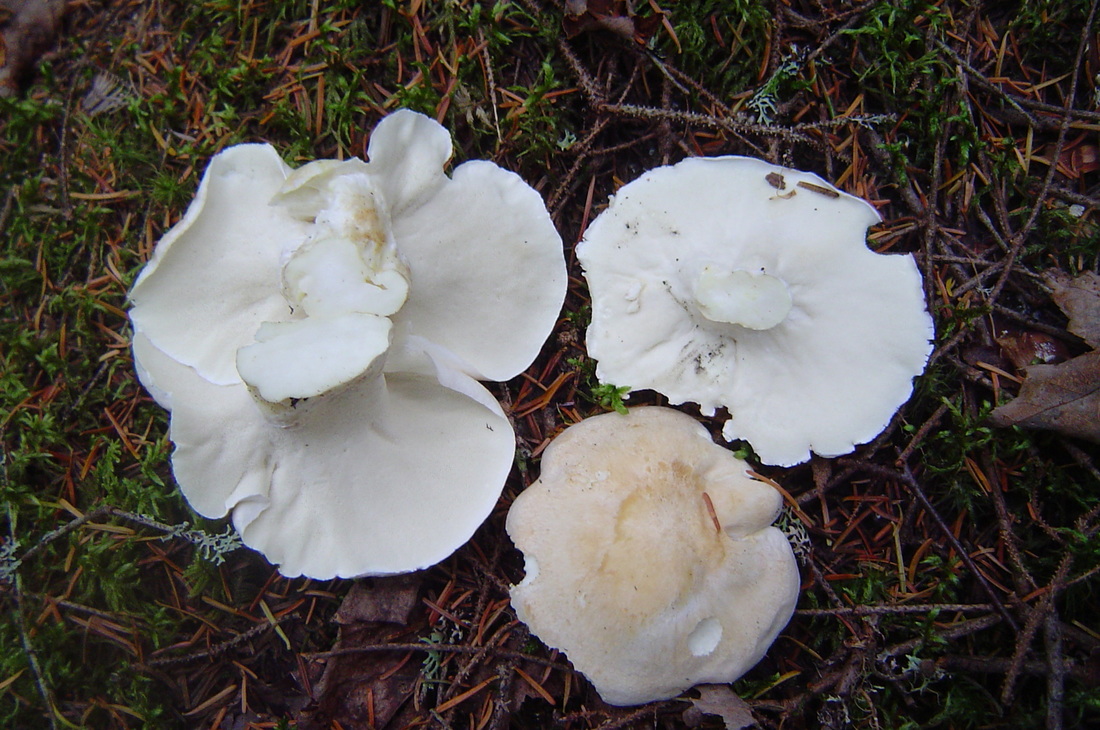 Undersidan har små, runda till kantiga porer istället för skivor. Porlagret är vitt och blir gulaktigt när svampen blir äldre eller trycks. Foten är kort, tjock och vit, ofta något excentriskt placerad.