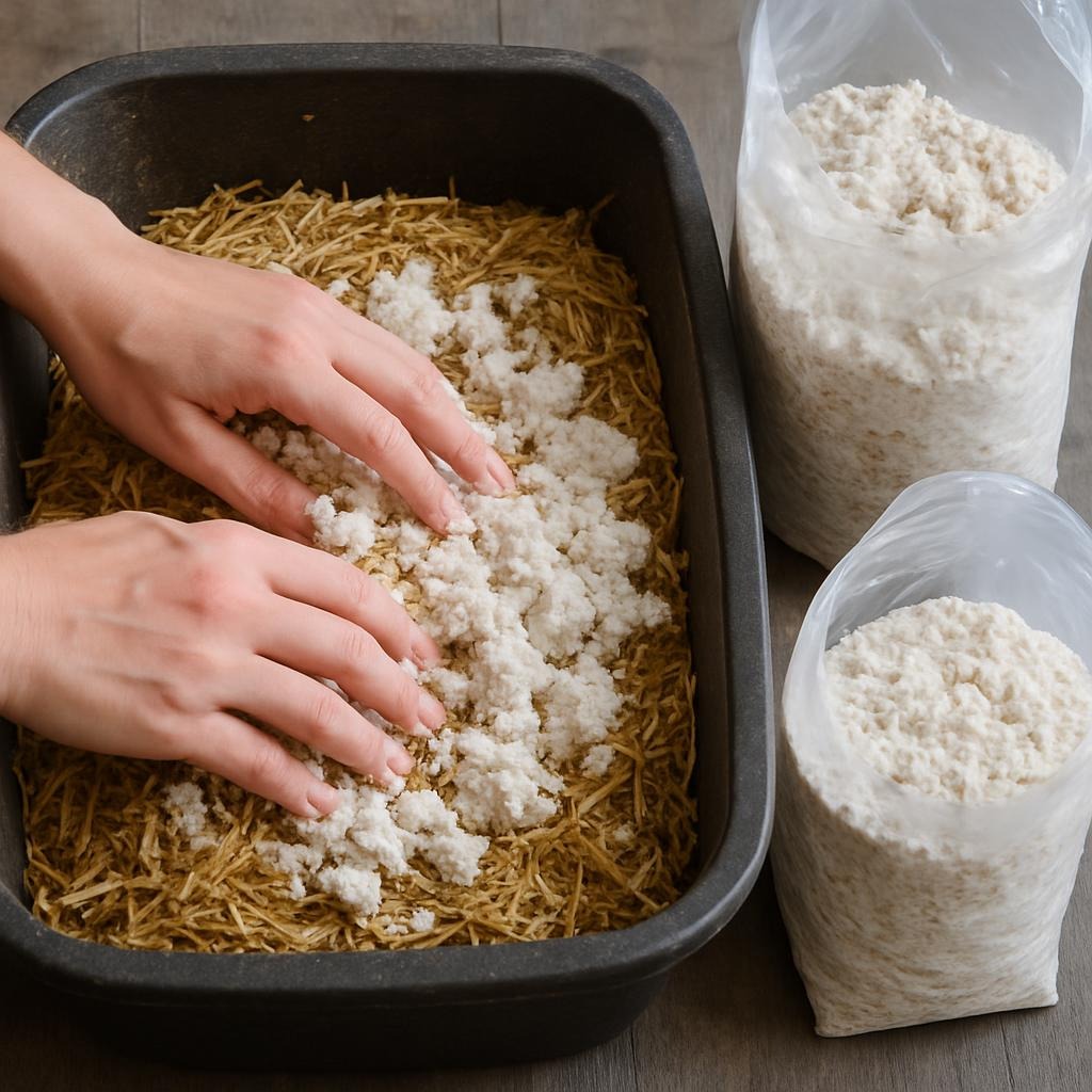 Inokulering innebär att du tillsätter svampmycel till substratet. Mycelet fungerar som “fröet” för svampen och sprider sig genom substratet när förhållandena är rätt.