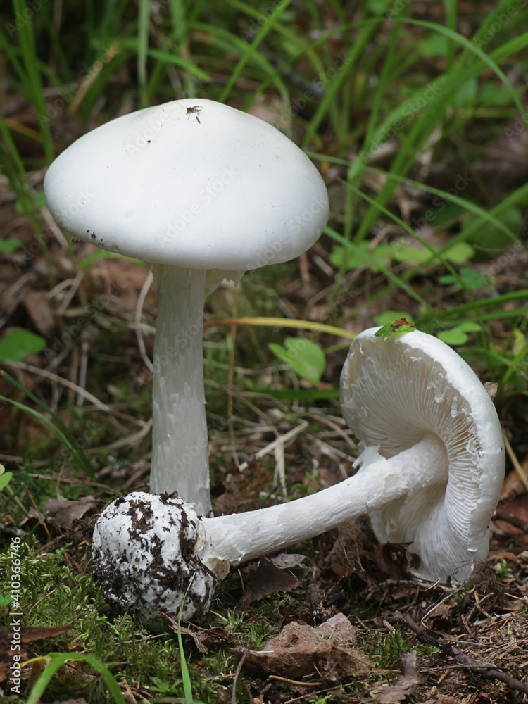 5–12 cm, vit, med kraftig ring och ibland svagt gulnande vid basen.