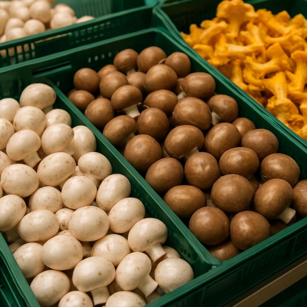 Färska svampar är ofta det första man ser i butiken. Här finns champinjoner i flera varianter, som vit champinjon, kastanjechampinjon och portabello. Kantareller säljs ofta under säsong och är uppskattade för sin fruktiga smak och gyllengula färg. Karljohan, eller stensopp, kan ibland köpas färsk men finns ofta fryst eller torkad. Ostronskivling är populär i både svenska och asiatiska rätter, medan shiitake och enoki är vanliga i asiatiska matvarubutiker. Andra färska svampar som kan dyka upp är king oyster (kronärtskockssvamp), pioppino och portabello.